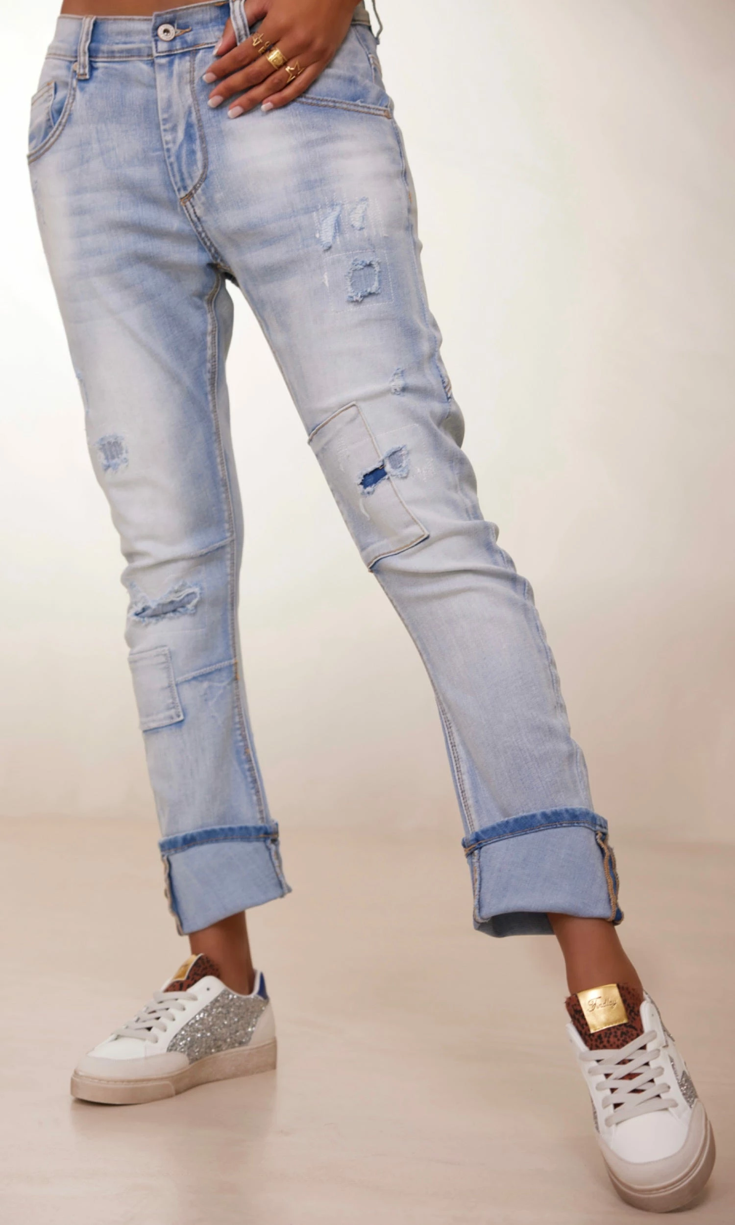 - Effet usé et déchiré avec patchs dessous ne laissant pas voir la peau
