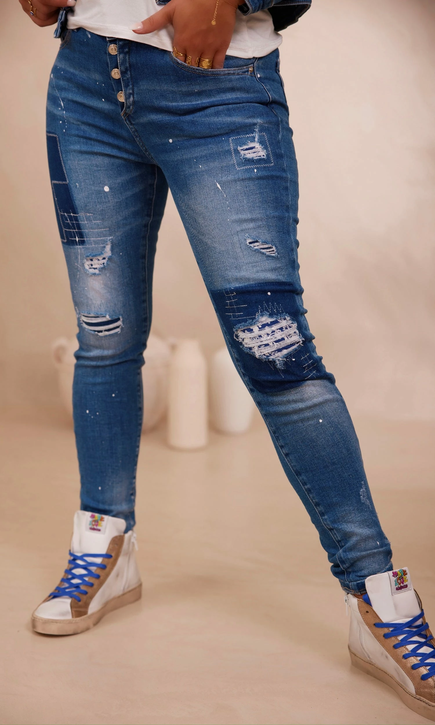 - Effet déchiré sur le devant avec patchs en dessous ne laissant pas voir la peau