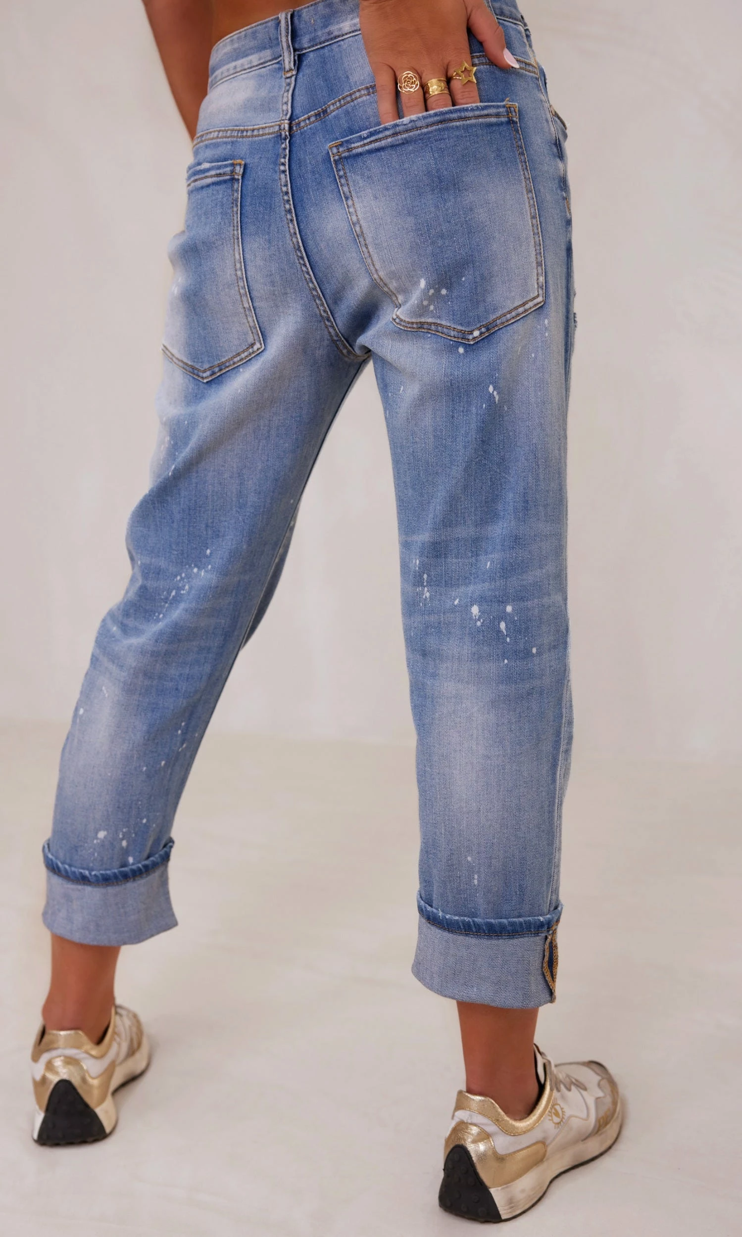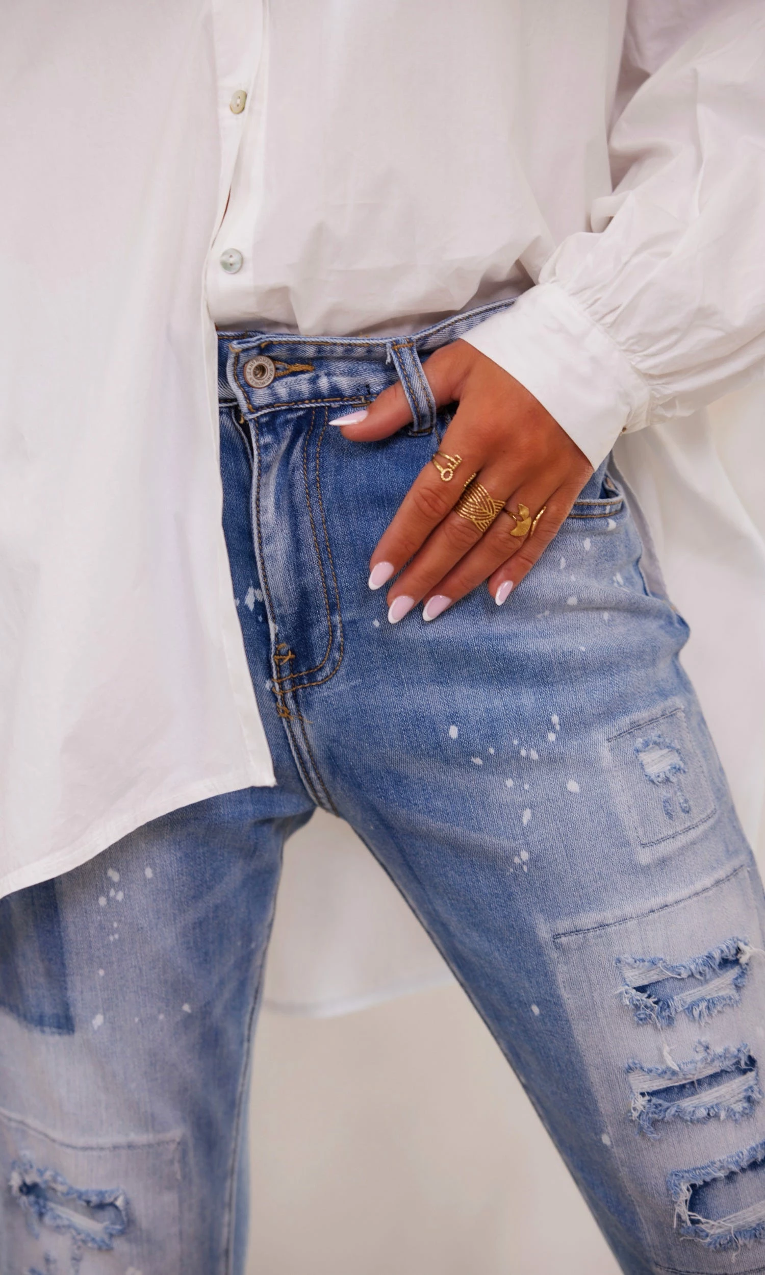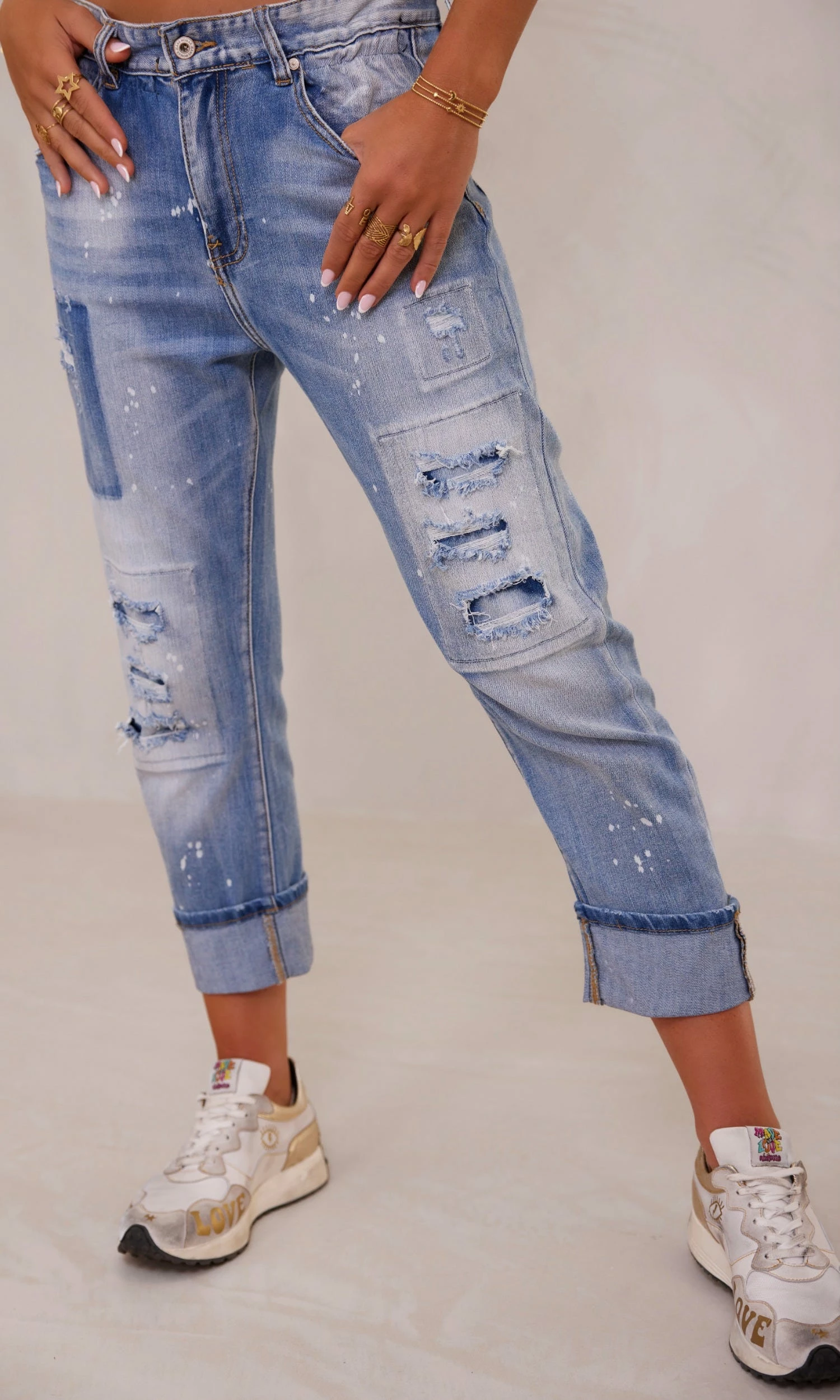 - Effet usé et déchiré avec patchs dessous ne laissant pas voir la peau et effet délavé