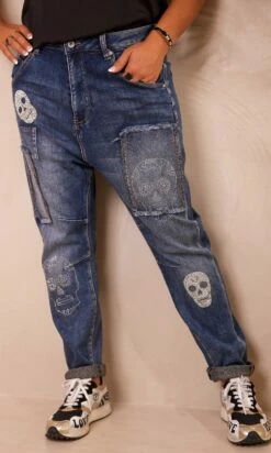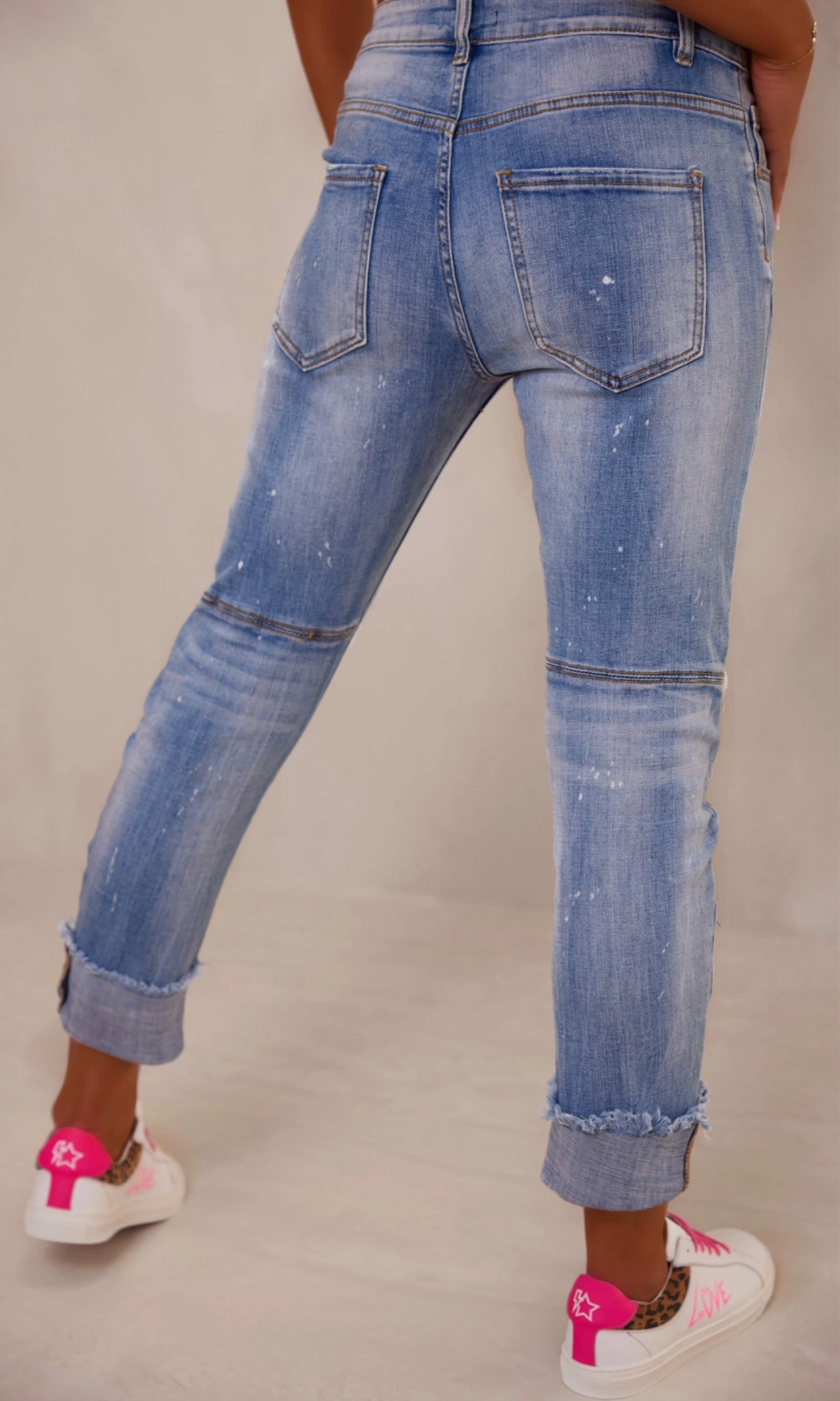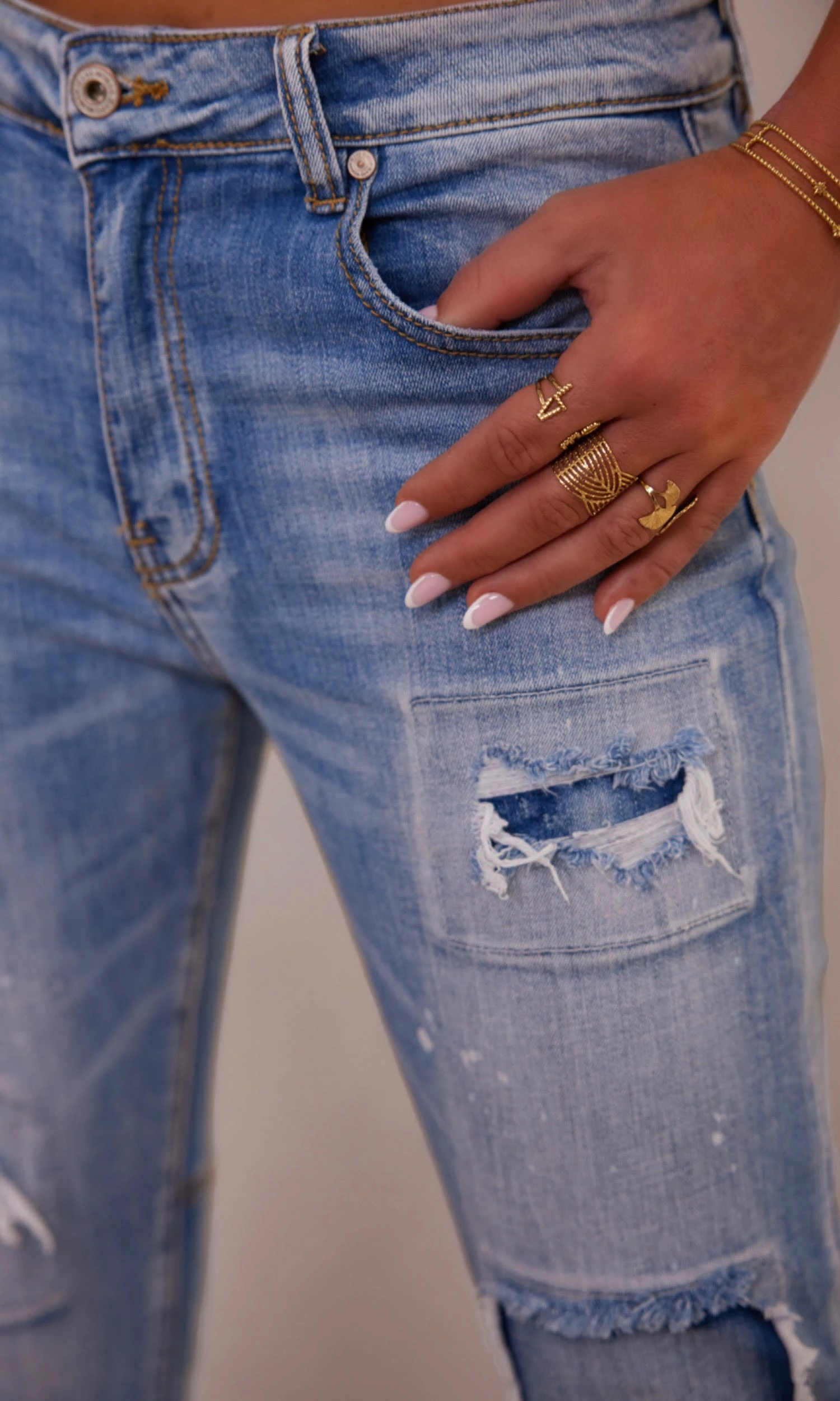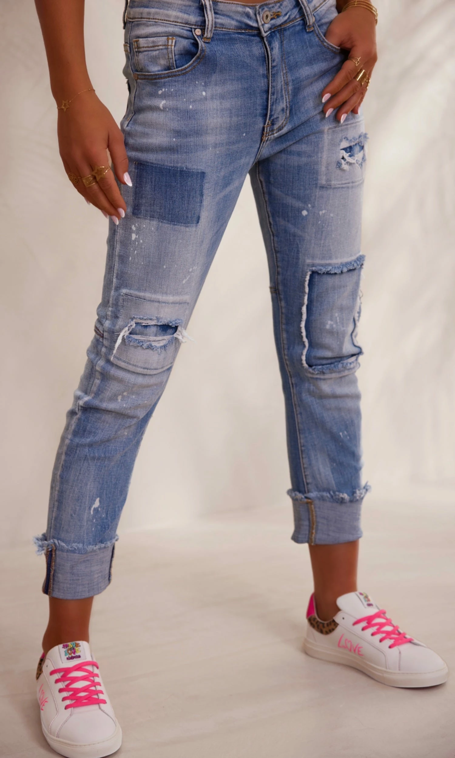- Effet usé et déchiré avec patchs dessous ne laissant pas voir la peau et effet délavé