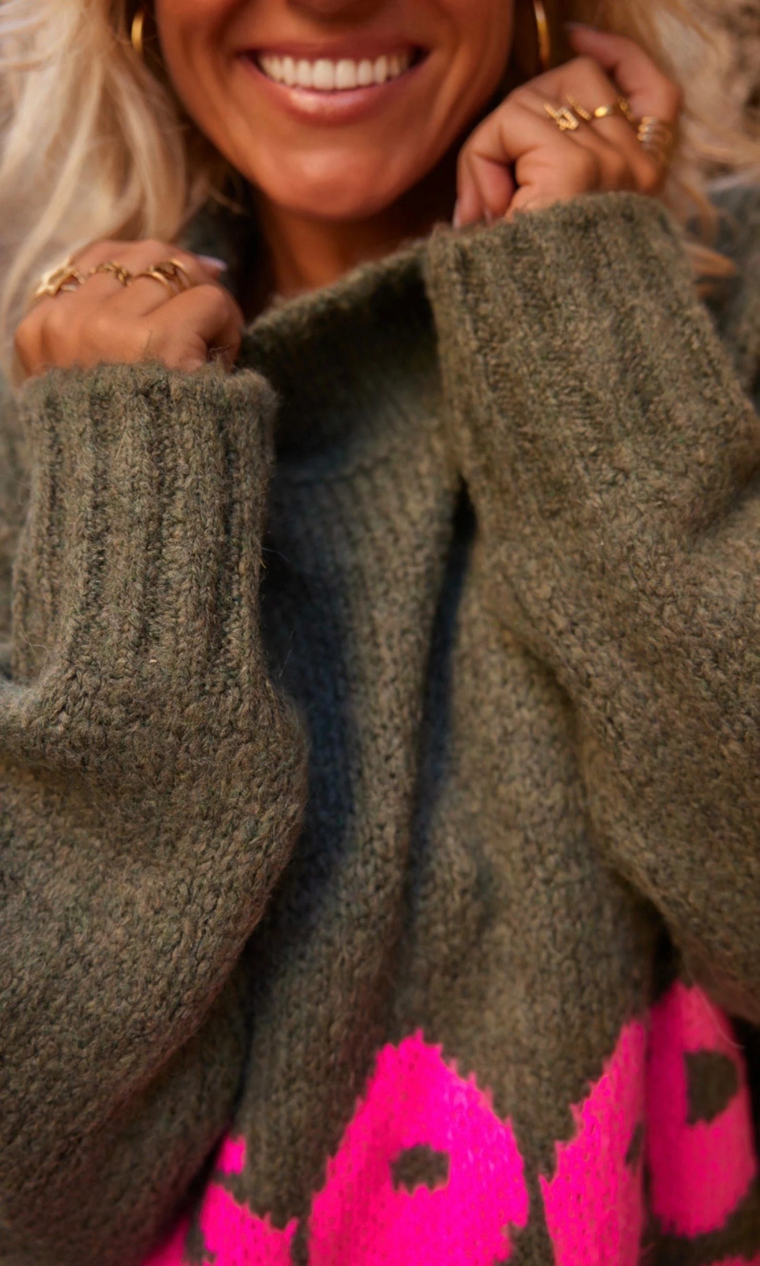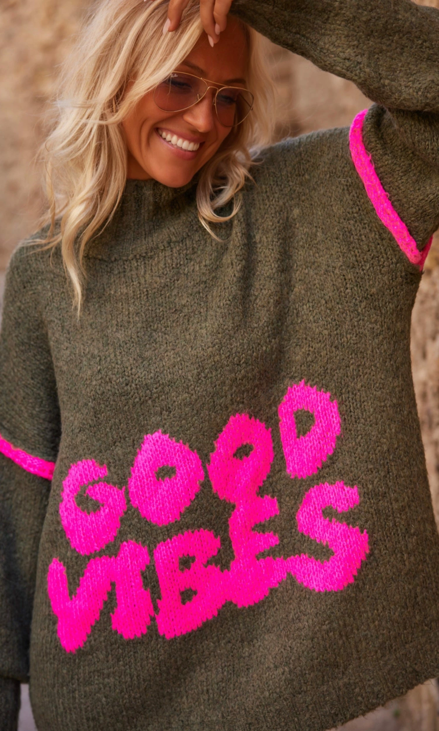 Pull Amaury Kaki Good Vibes Rose Fluo