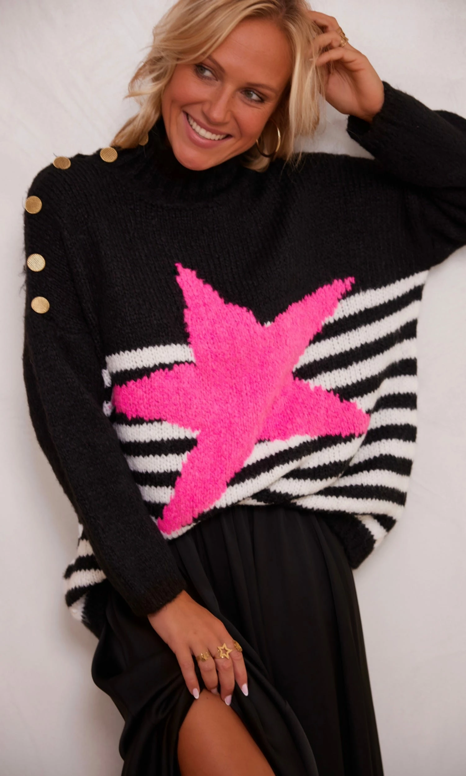 Pull Loann Noir Marinière Blanc Star Rose