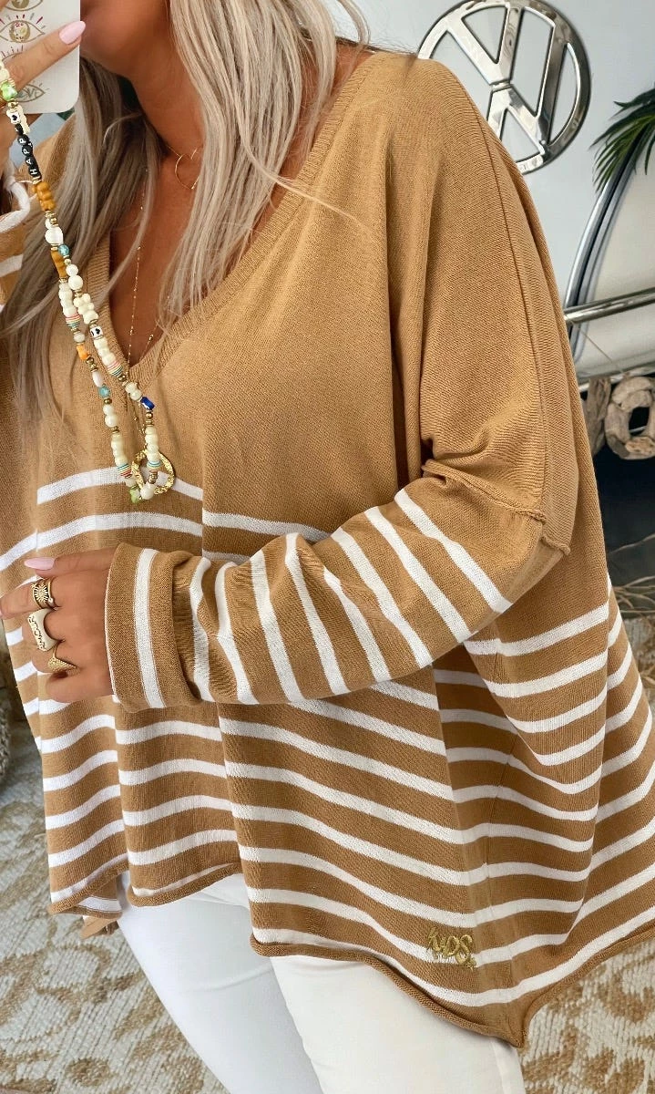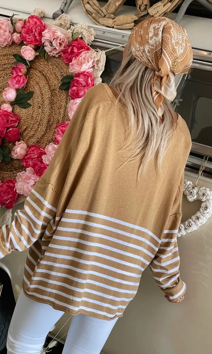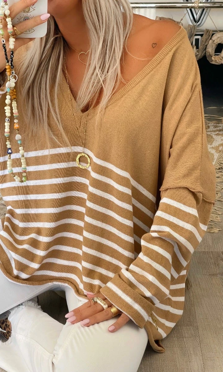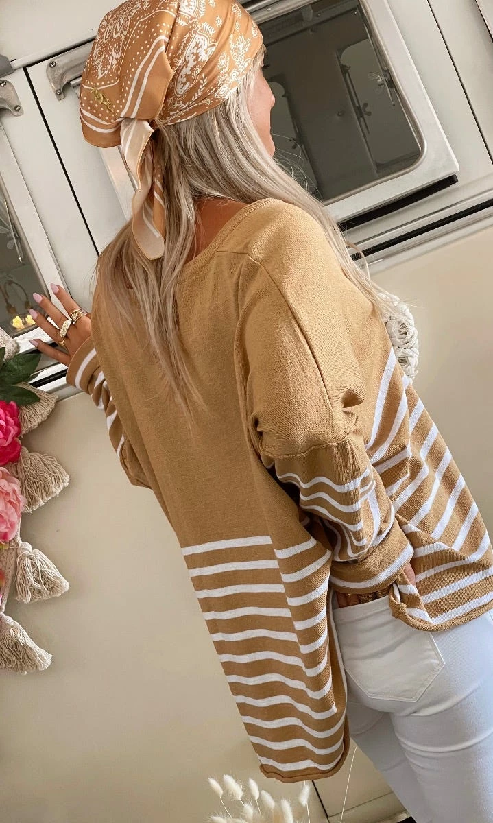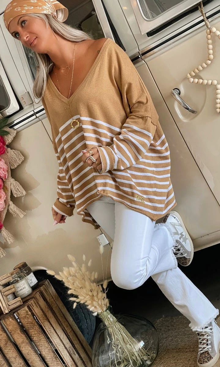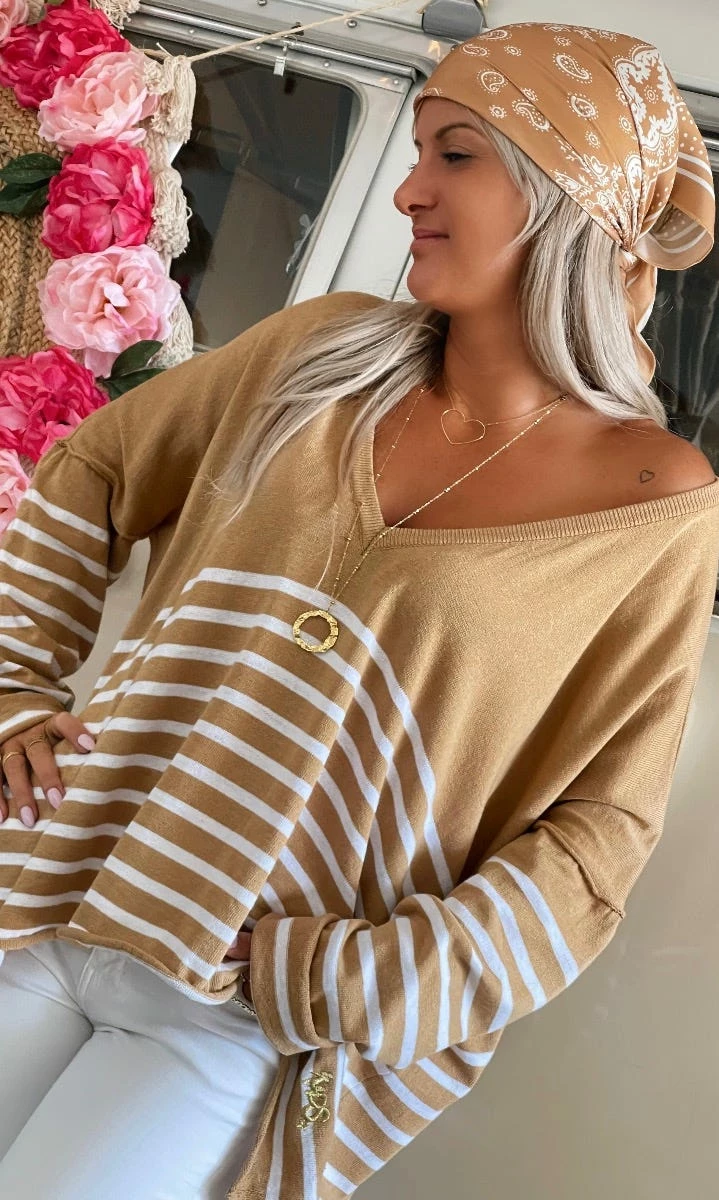 Pull Marius Oversize Camel Marinière Blanc