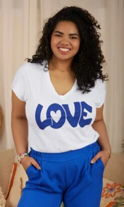 T-Shirt Magda Blanc Marinière Bleu Happy Love Karma Rose Fluo