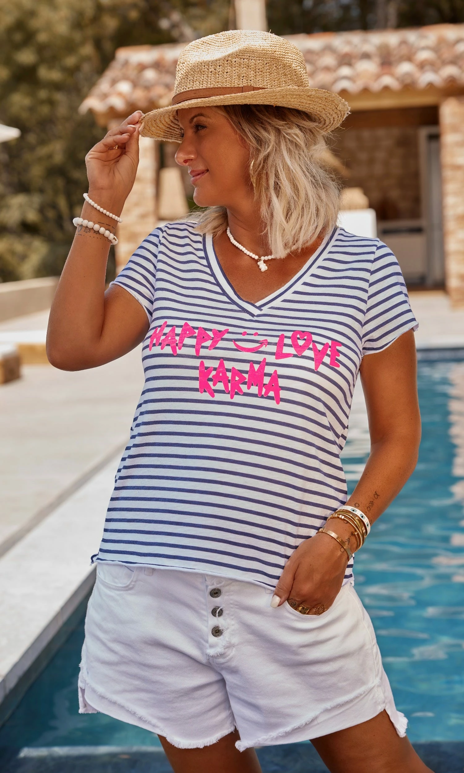 T-Shirt Magda Blanc Marinière Bleu Happy Love Karma Rose Fluo