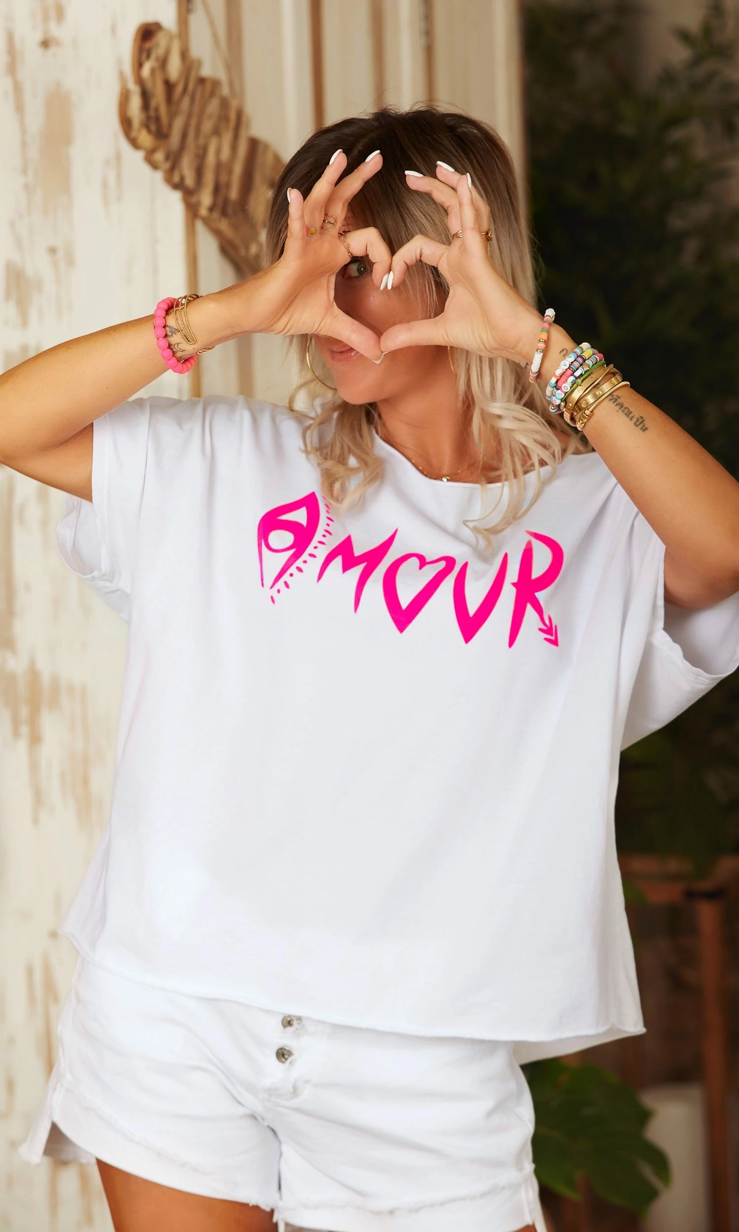 T-Shirt Solene Oversize Blanc Amour Rose Fluo